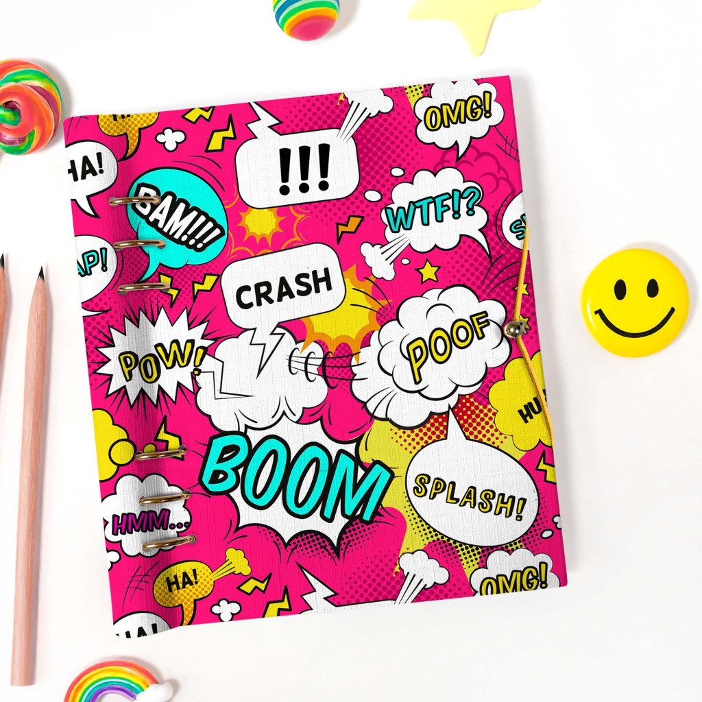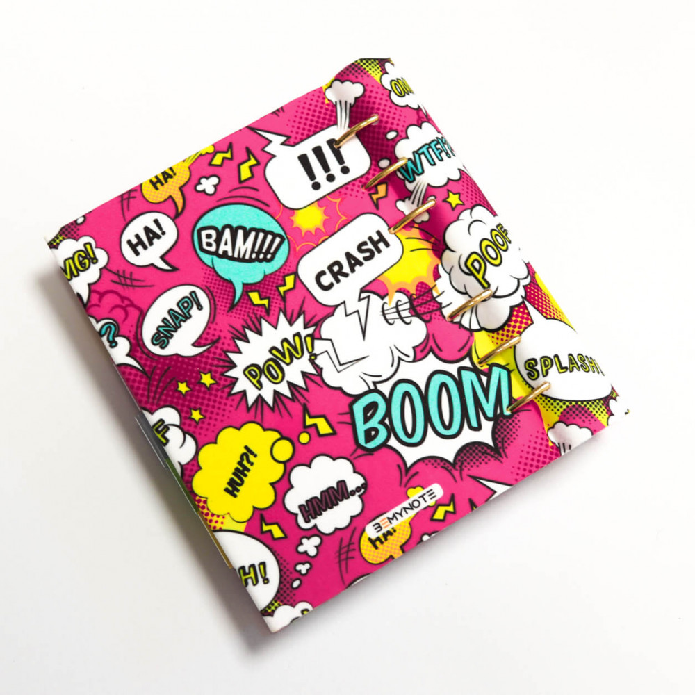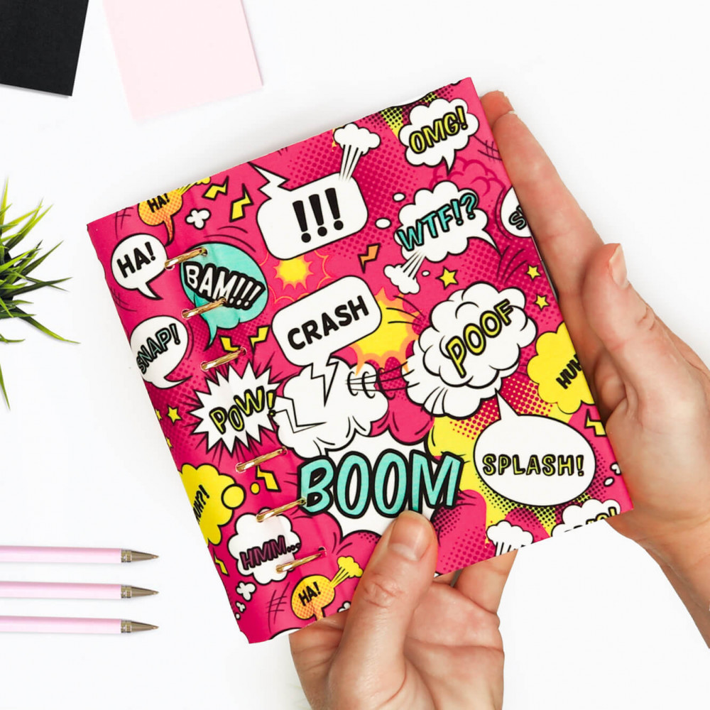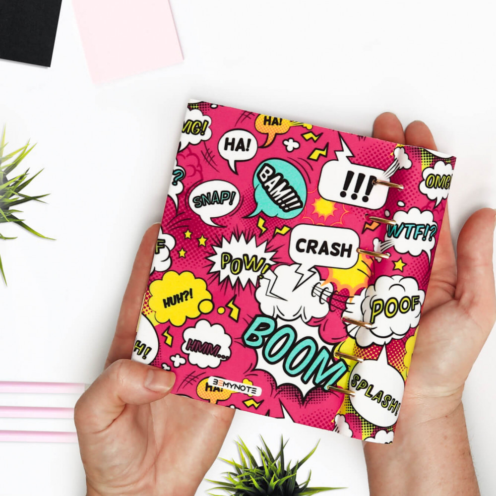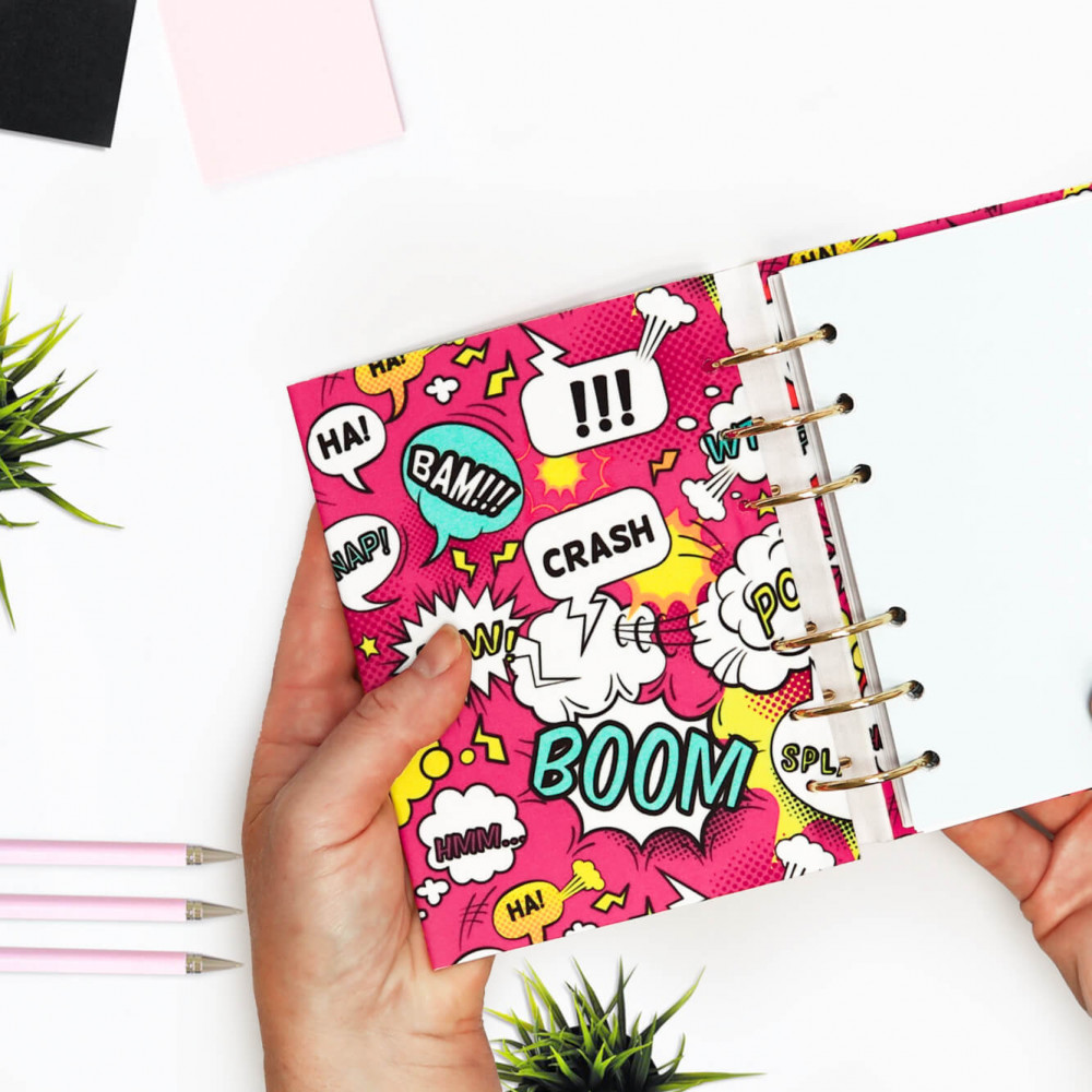 Névre szóló gyűrűs kalendárium vagy egyedi határidőnapló 2026 évre A5, B6 vagy A6 méretben cserélhető lapokkal rózsaszín alapon képregény mintával. Szuper személyre szóló ajándék névvel kamaszlányoknak, egyetemistáknak, fiatal lányoknak, barátnőnek egyaránt.