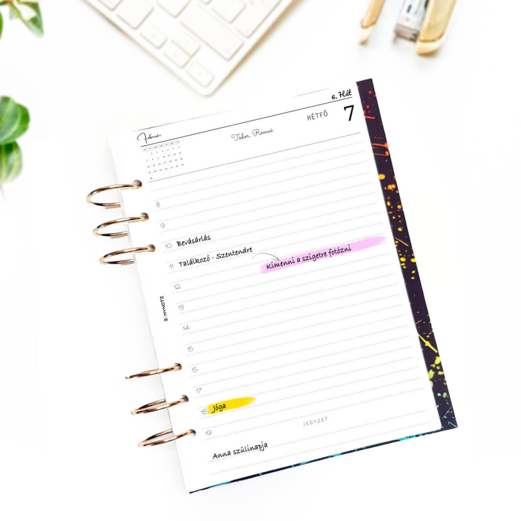 A betétlap ideális választás azoknak, akik részletes napi időmenedzsmentre törekednek – akár üzleti, akár személyes használatra. Könnyen illeszthető bármely szabványos A5 gyűrűs kalendáriumba (6-gyűrűs lyukasztású). Saturnus vagy Filofax gyűrűs kalendáriumokkal, naptárakkal is kompatibilis.