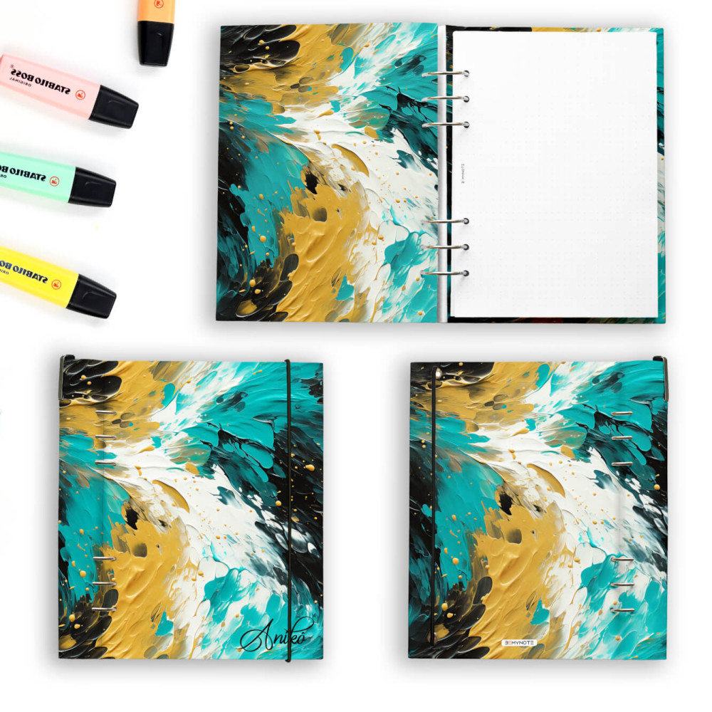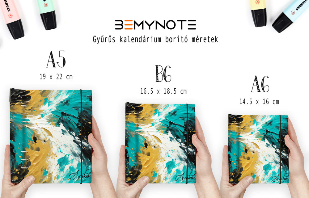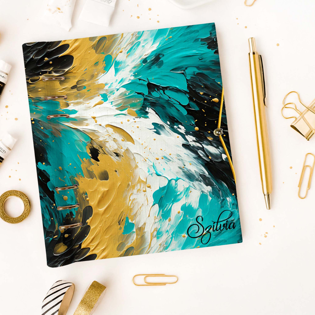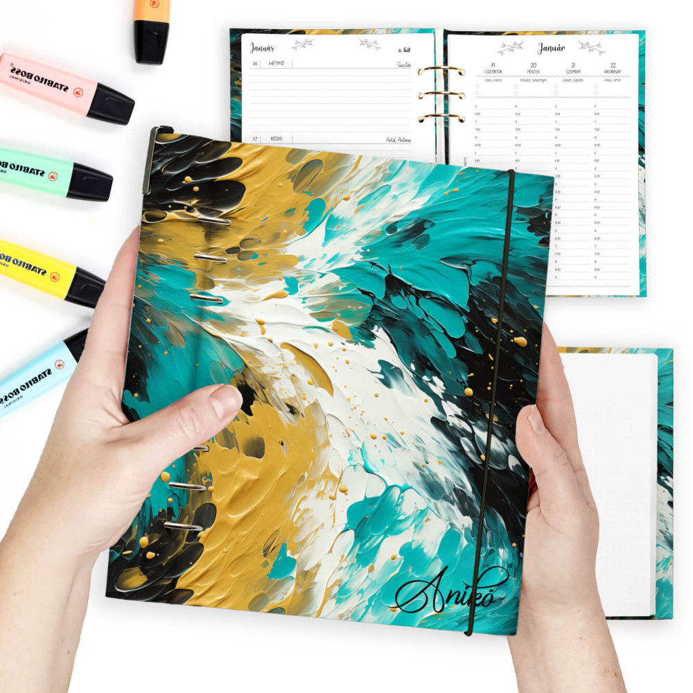 Névre szóló modern, absztrakt mintás Designer Türkiz Határidőnapló 2026 évre, amely különleges és praktikus ajándék lehet Karácsonyra, Születésnapra. Naptár és jegyzetfüzet egyben, A5, B6 és A6 méretek közül választhatsz, hogy megtaláld az igényeidnek megfelelőt.