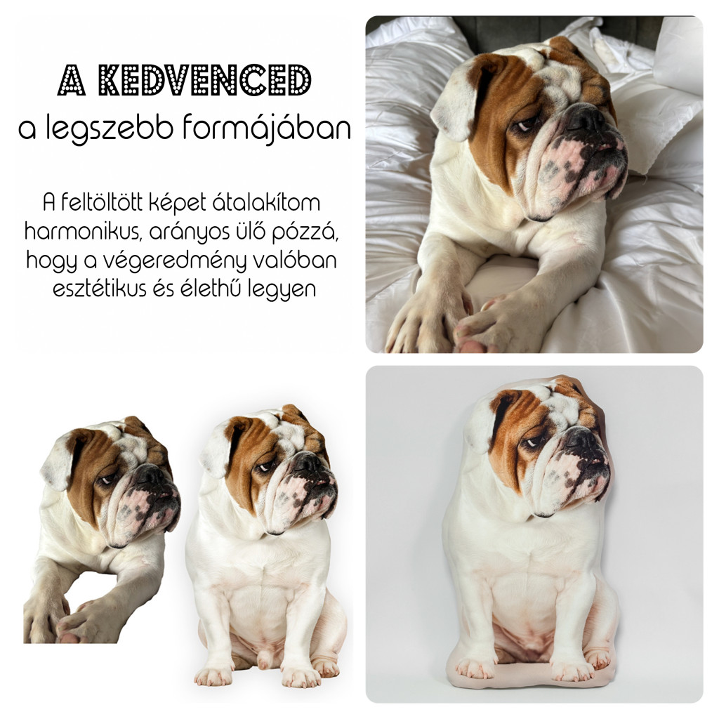 Minden egyedi párna esetében a cél egy arányos, esztétikus, „tökéletes ülő póz” megalkotása, amely párnaként is szépen mutat és tartós formát ad. A feltöltött fotót alapértelmezés szerint ennek megfelelően alakítom át: