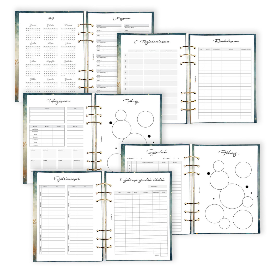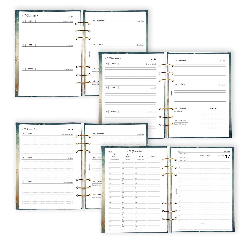 A gyűrűs kialakítás lehetővé teszi, hogy a naptár ne csak határidőnapló legyen, hanem egy sokoldalú rendszer, amit a saját igényeidhez alakíthatsz. Használhatod napi vagy heti tervezőként, jegyzetfüzetként, vagy akár kreatív bullet journal alapként is. A betétlapok szabadon variálhatók, így pontosan olyan belsőt állíthatsz össze, ami a legjobban működik számodra.