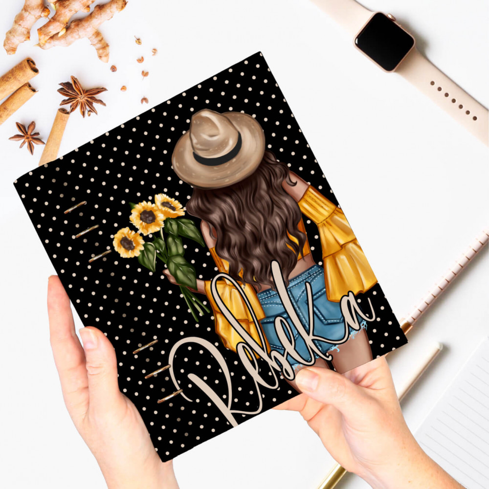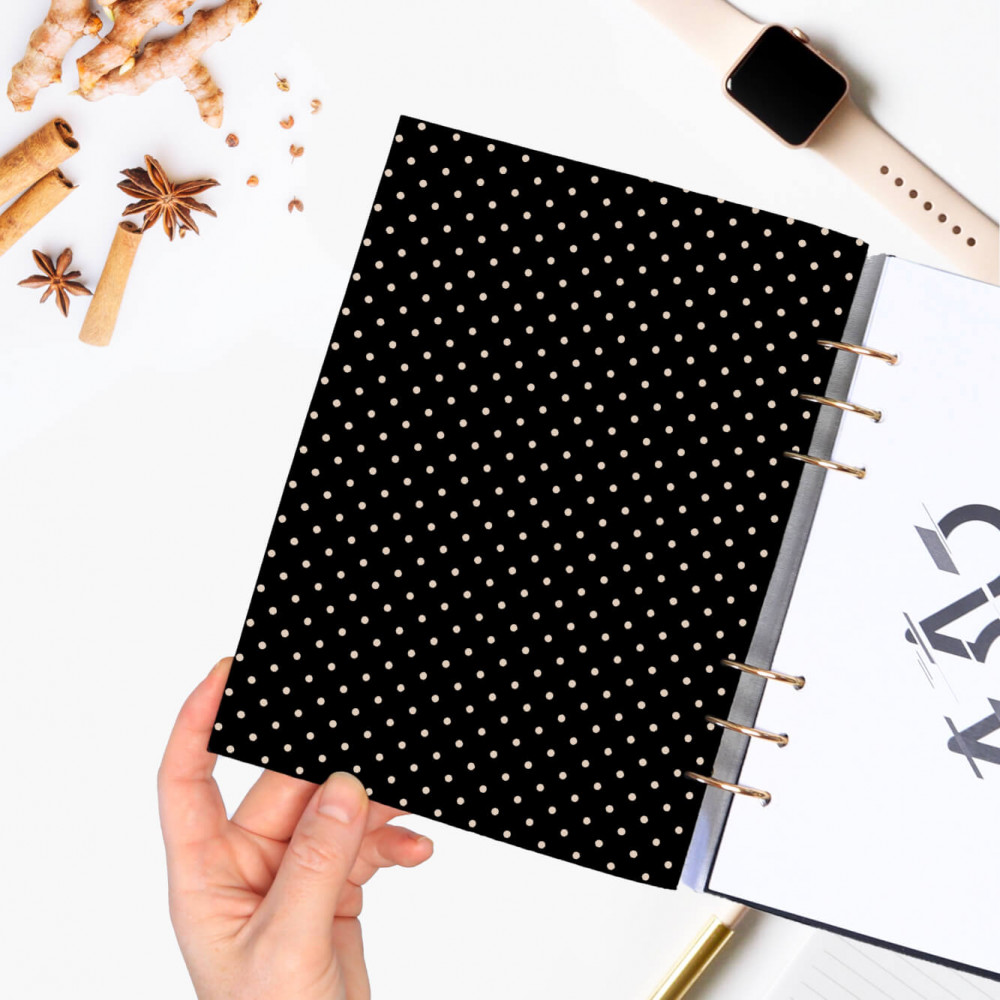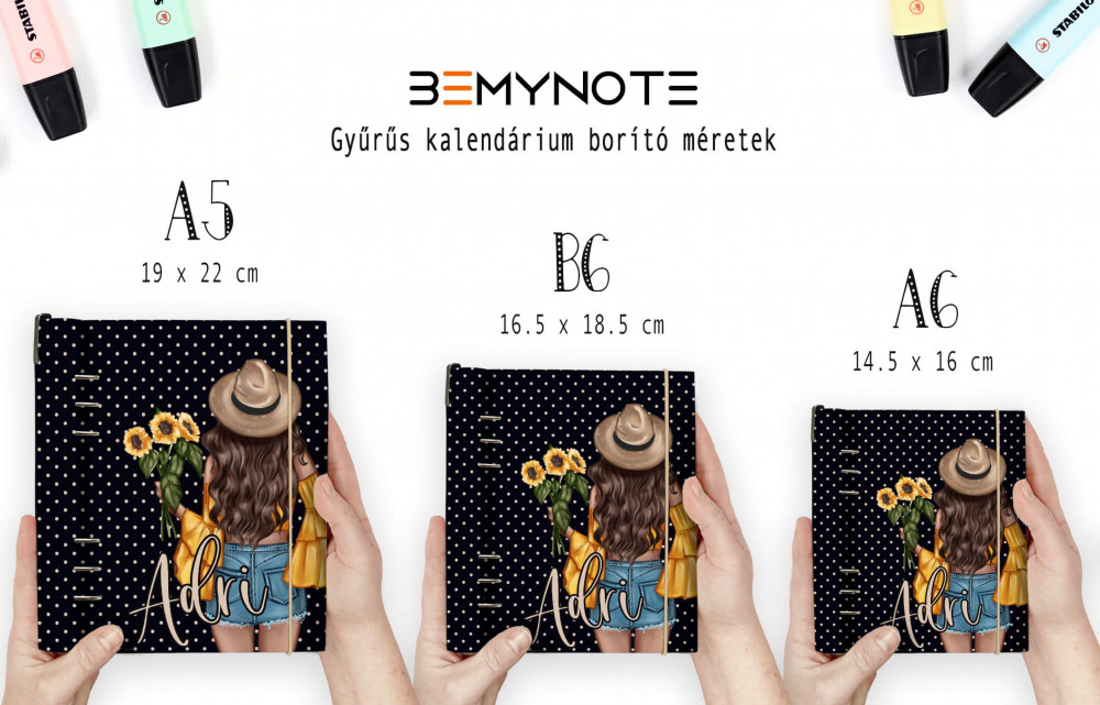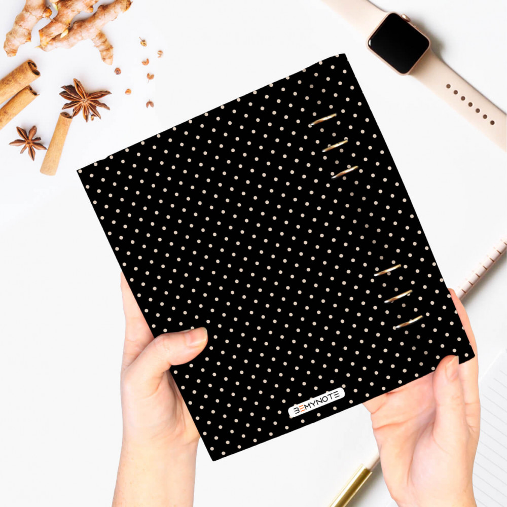 Egyedi fekete alapon bézs pöttyös névre szóló gyűrűs határidőnapló 2026 trendi csajos grafikával. Praktikus és egyben személyre szóló ajándék barátnőnek, feleségnek, édesanyának egyaránt. Ha ponthálós betétlapokkal rendeled használható bullet journalként.