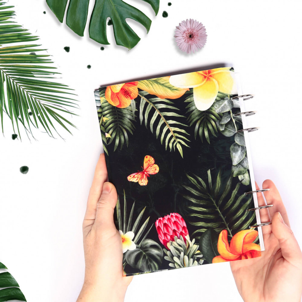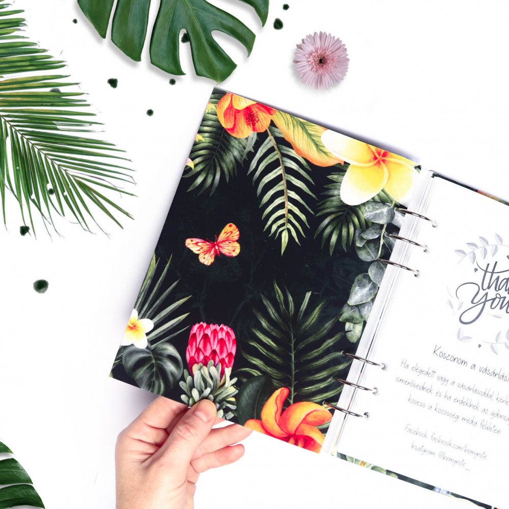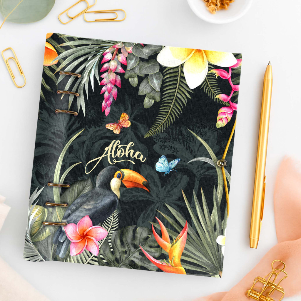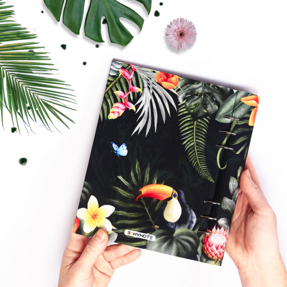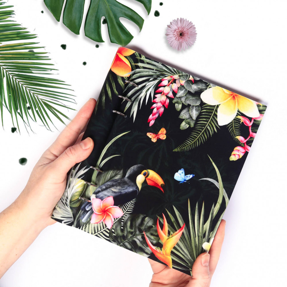 A5, B6 vagy A6 méretű egyedi gyűrűs kalendárium, határidőnapló 2026 sötétzöld alapon különleges tukán és pálmalevél mintás élénk színű vízfesték hatású grafikával.
