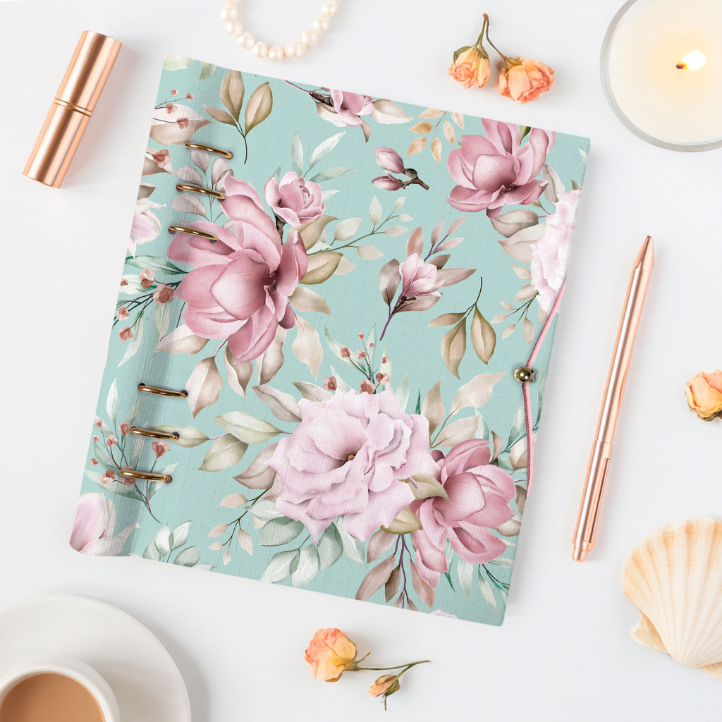 A borítót lágy rózsaszínes és mályvás árnyalatú virágok díszítik, harmonikusan elrendezve a friss, pasztellzöld háttéren. Ez a romantikus, mégis kifinomult kompozíció megnyugtató hatású, és bármilyen asztalon elegánsan mutat.