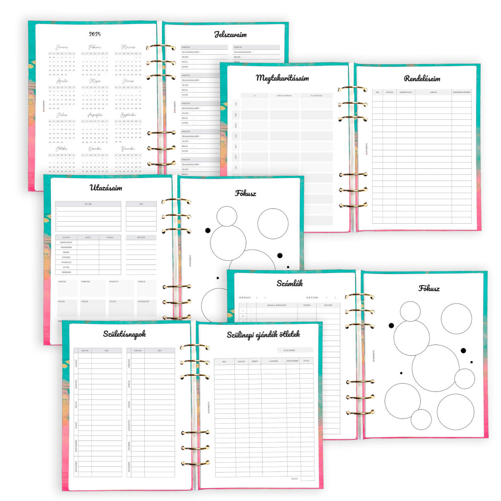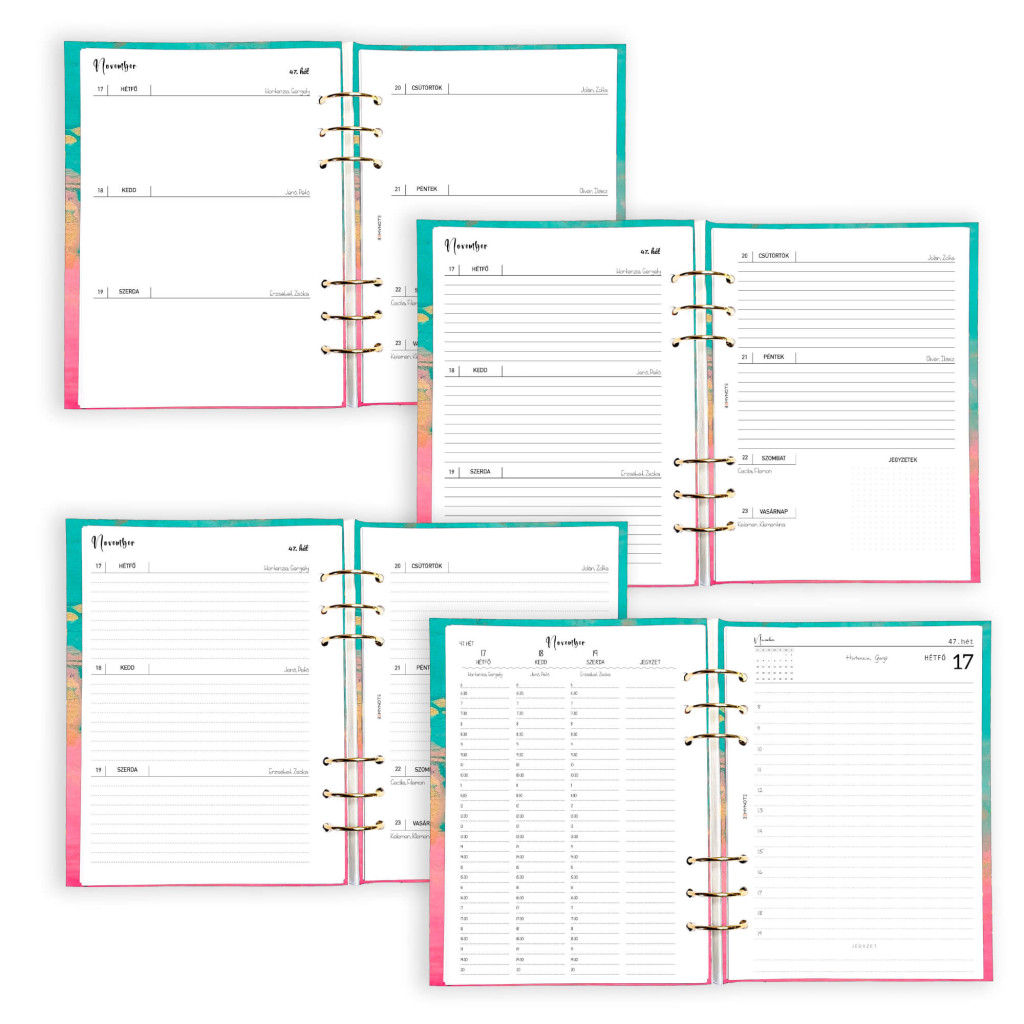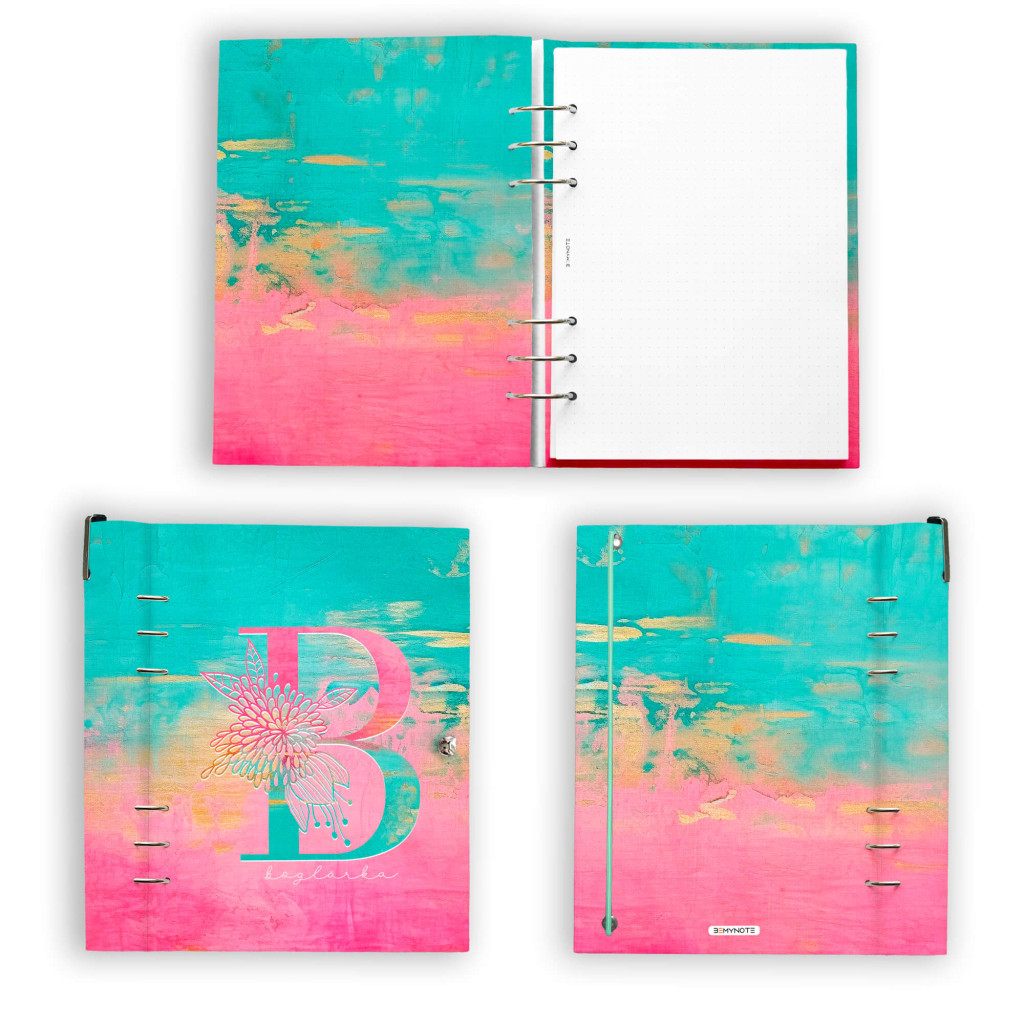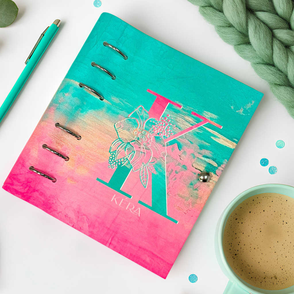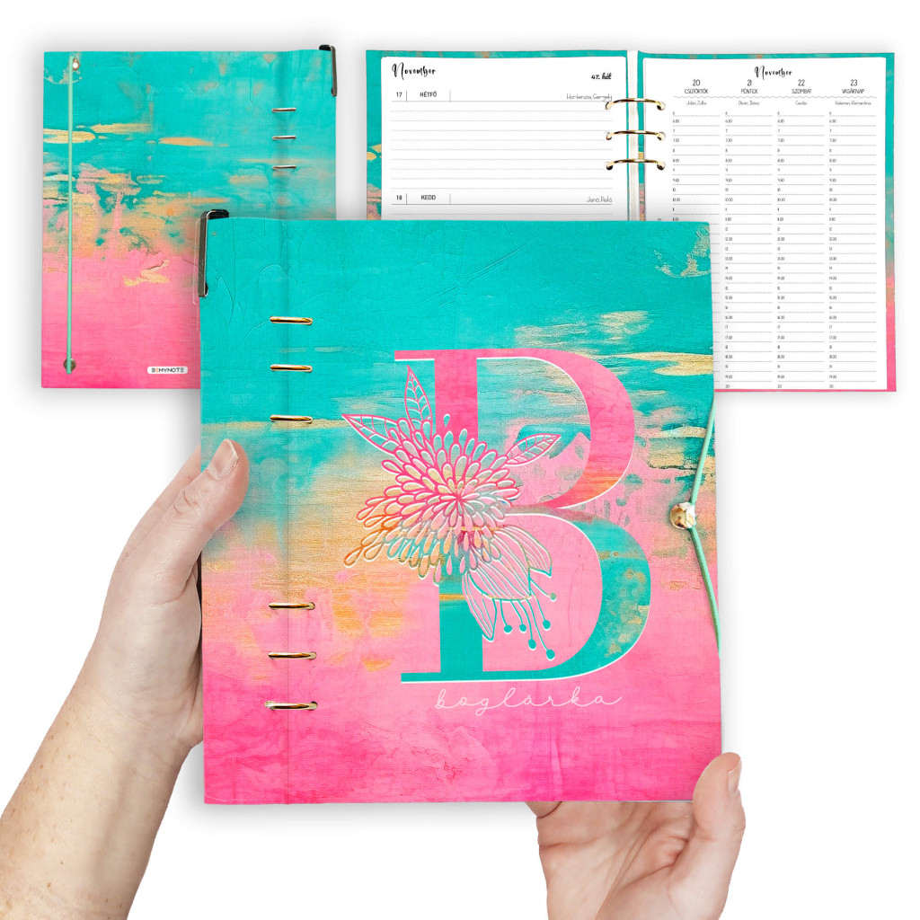 Névre szóló pink-türkiz gyűrűs naptár 2026 évre különleges monogrammos borítóval. Tökéletes választás, ha csajos, praktikus, napi szinten használható határidőnaplót vagy noteszt keresel személyre szóló ajándék céljából. A klasszikus A5 méret mellett B6 és A6 méret is választható, a cserélhető betétlapoknak köszönhetően bullet journalnak is kiváló - válaszd hozzá a pontrácsos jegyzetlapokat. A praktikus, jól átgondolt kialakításának köszönhetően könnyen kezelhető és könnyen félbehajtható, mint egy spirálfüzet.