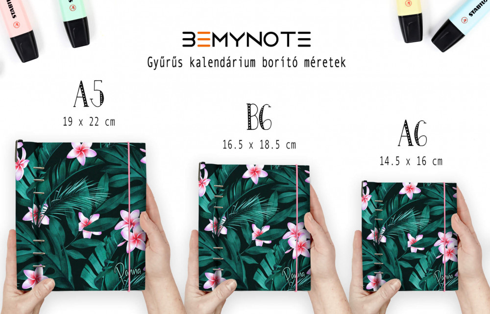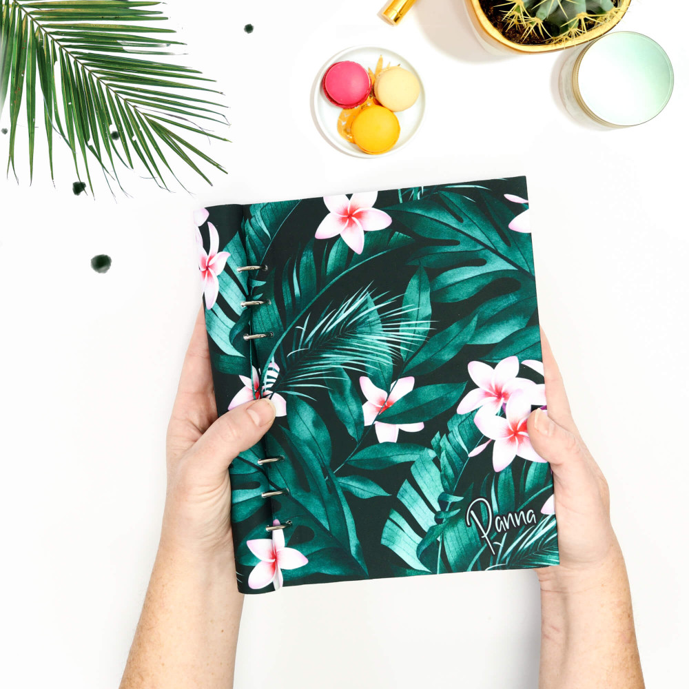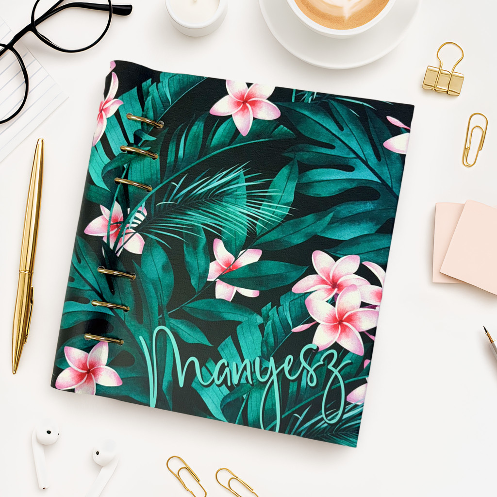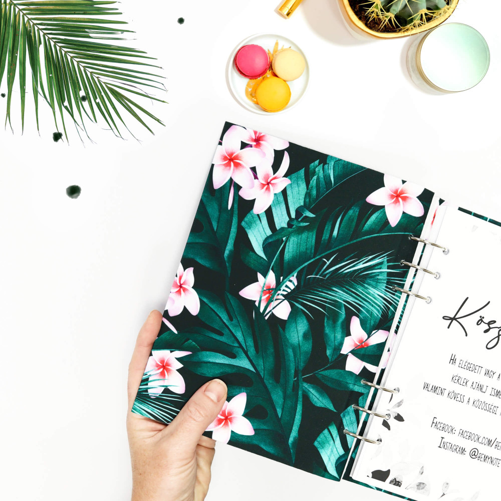 Hawaii hangulatú türkizzöld pálmaleveles egyedi határidőnapló, naptár 2026 évre A5, B6 vagy A6 méretben opcionálisan heti/napi tervezővel, vonalas vagy pontozott jegyzetlapkkal. Műbőr jellegű, kemény fedelű borítóval és nyitható gyűrűkkel, cserélhető betétlapokkal készül. Személyre szóló ajándékötlet barátnőnek, feleségnek!