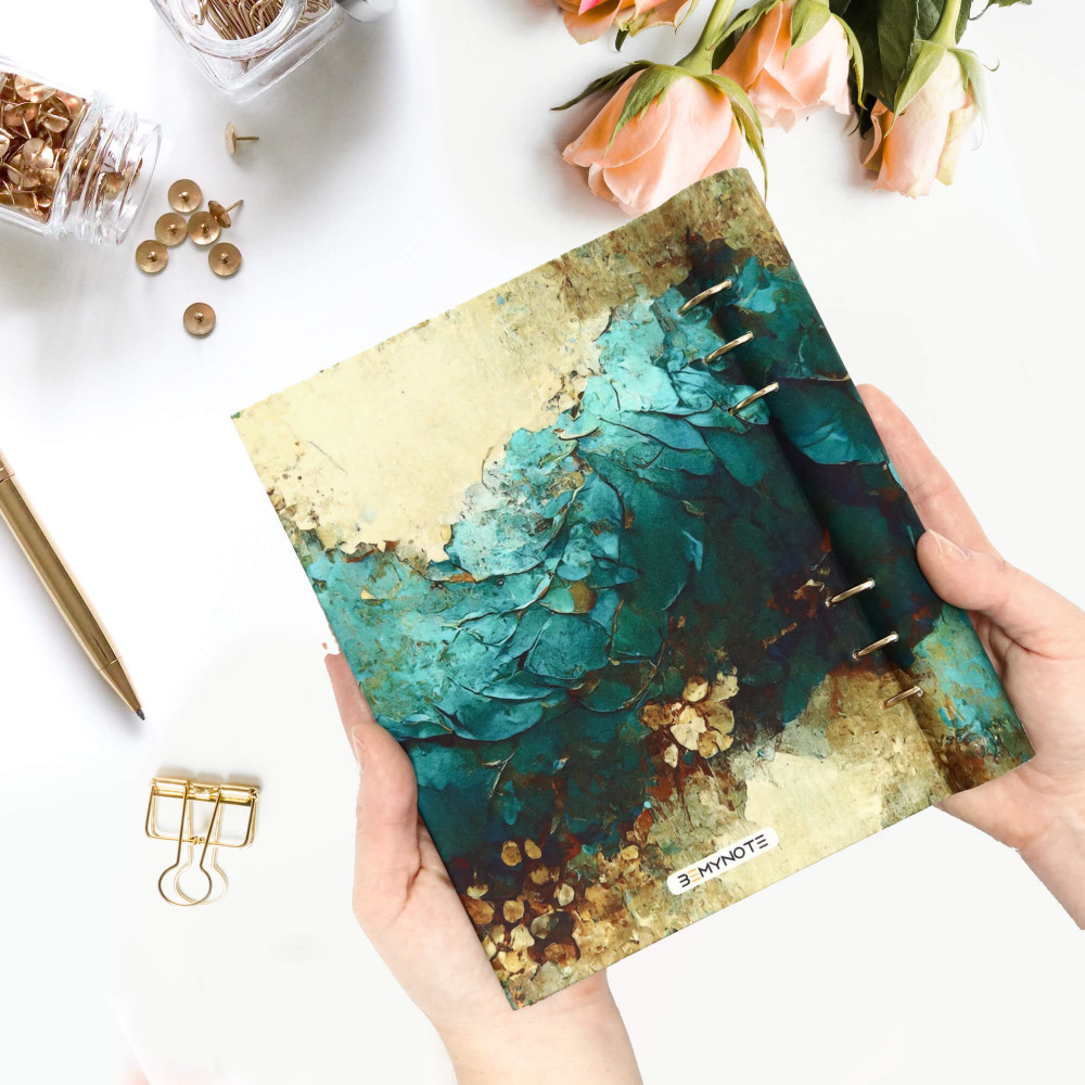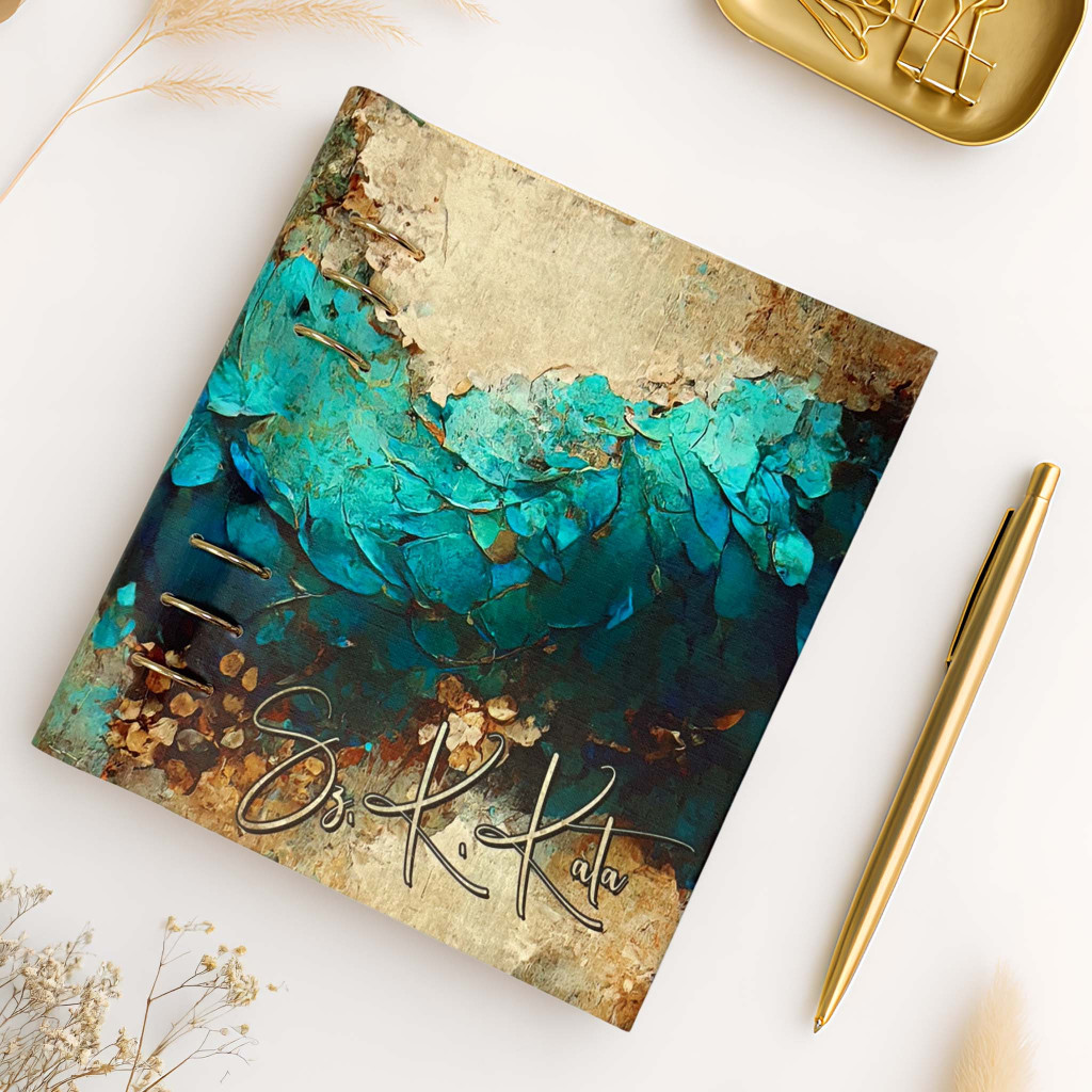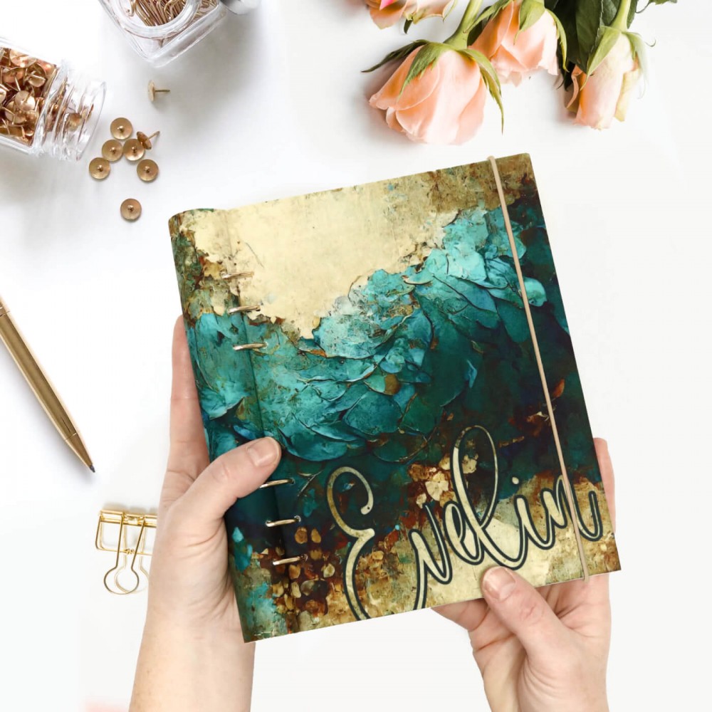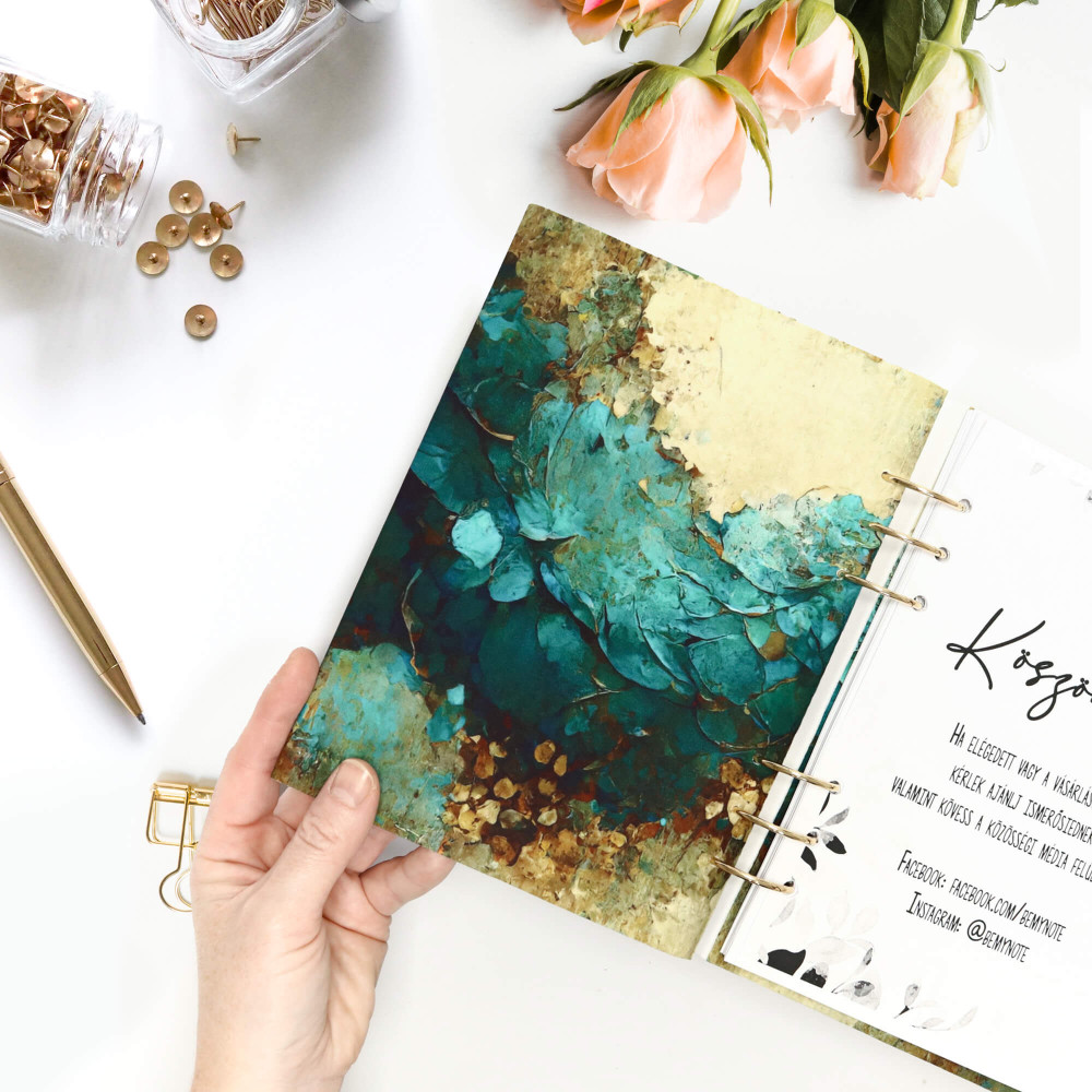 Nagyon különleges türkiz zöld alapon arany hatású egyedi névre szóló gyűrűs határidőnapló 2026 évre A5, B6 vagy A6 méretben. Ez a személyre szóló naptár nyitható gyűrűkkel, kemény fedelű, de puha tapintású félbehajtható borítóval és cserélhető lapokkal készül megrendelésre.