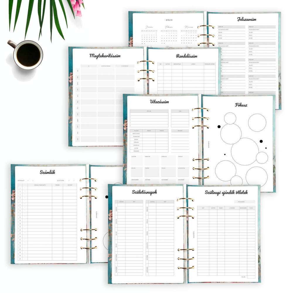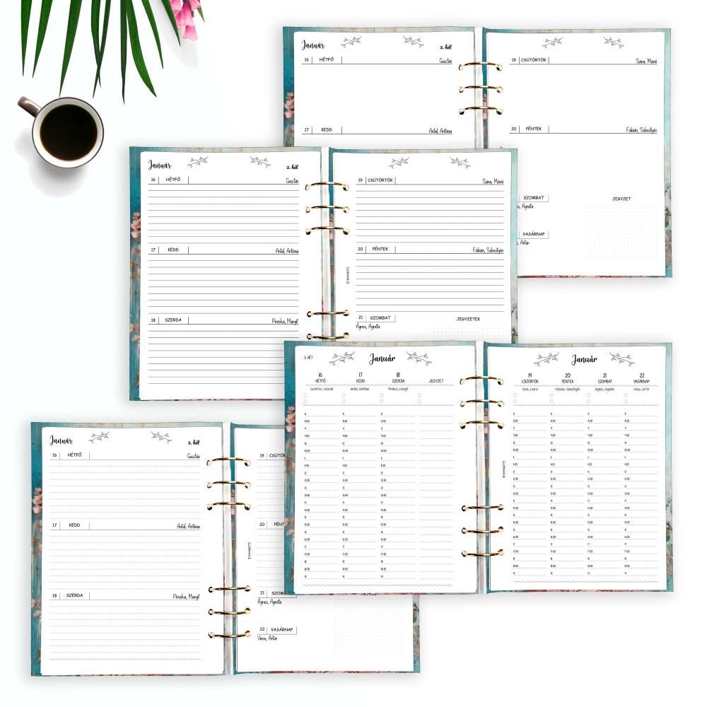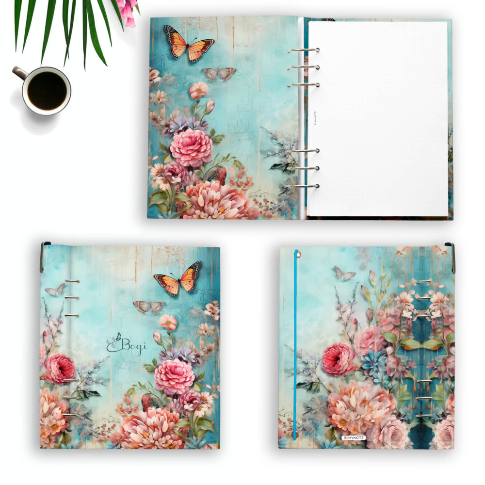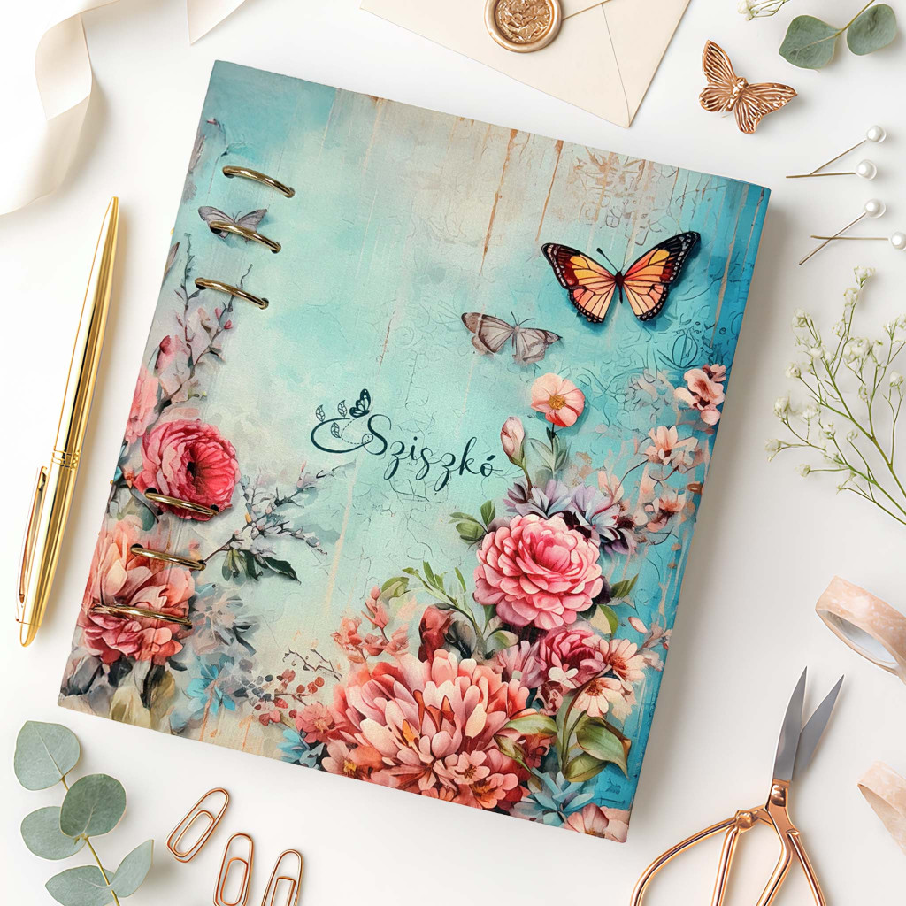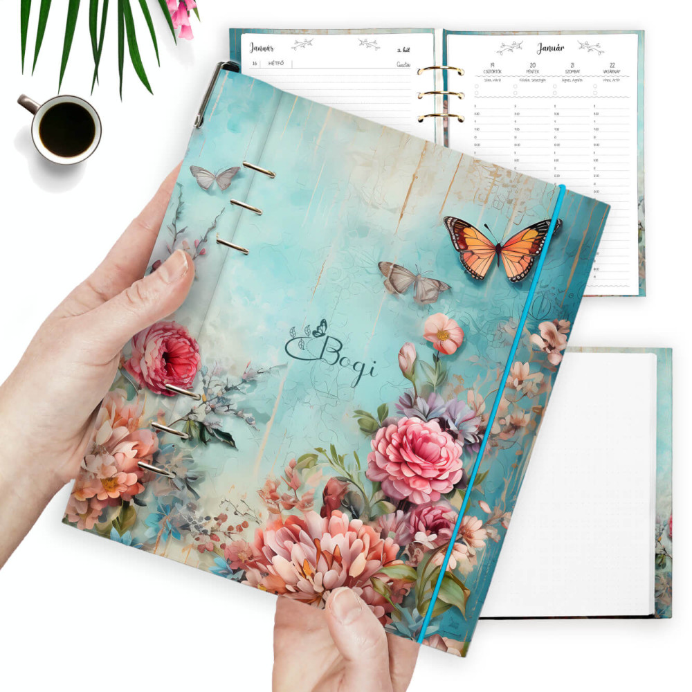 Egyedi névre szóló türkizkék határidőnapló/naptár 2026 vagy gyűrűs füzet pillangó és virág mintás borítóval, ami tökéletes választás, ha nőies, praktikus, napi szinten használható terméket keresel pl ajándék céljából. Az A5 méret mellett B6 és A6 méretű változatok is rendelkezésre állnak, a választható betétlapoknak köszönhetően bullet journalnak is kiváló - válaszd hozzá a pontrácsos jegyzetlapokat. A praktikus, jól átgondolt kialakításának köszönhetően könnyen kezelhető és könnyen félbehajtható, mint egy spirálfüzet.